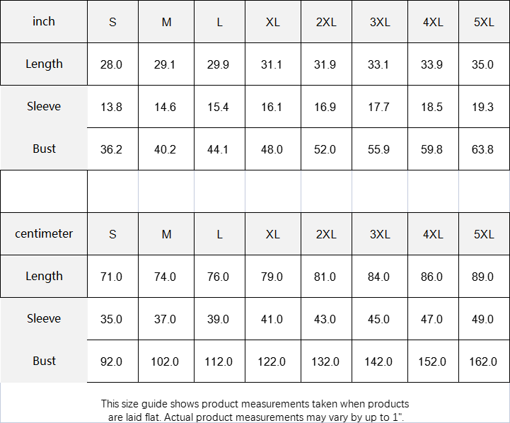 | inch | S | M | L | XL | 2XL | 3XL | 4XL | 5XL |