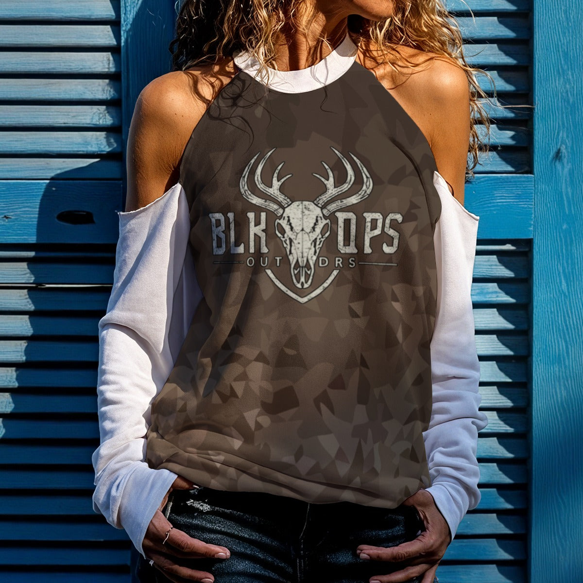 - Cold shoulder, crew neck, ribbed cuffs
